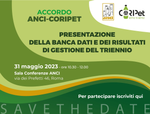 Il 31 maggio prossimo presso la Sala Conferenze Anci dalle 10.30 alle 12.00 sarà presentata la banca dati e i risultati di gestione del triennale accordo nazionale tra CORIPET e ANCI, sottoscritto nel maggio del 2020.