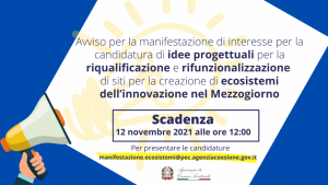 E’ online l’Avviso pubblico per la manifestazione di interesse per la candidatura di idee progettuali da ammettere ad una procedura negoziale finalizzata al finanziamento di interventi di riqualificazione e rifunzionalizzazione di siti per la creazione di Ecosistemi dell’innovazione nel Mezzogiorno.