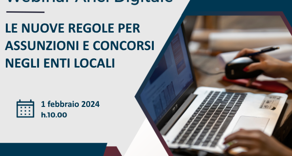 Giovedì 1 febbraio 2024 Anci Digitale propone un webinar gratuito, riservato agli Enti abbonati ai Servizi di Base – Anci Risponde sul tema delle assunzioni e dei concorsi per l’accesso al lavoro negli enti locali alla luce delle nuove regole introdotte con il DPR n. 82 del 16 giugno 2023.