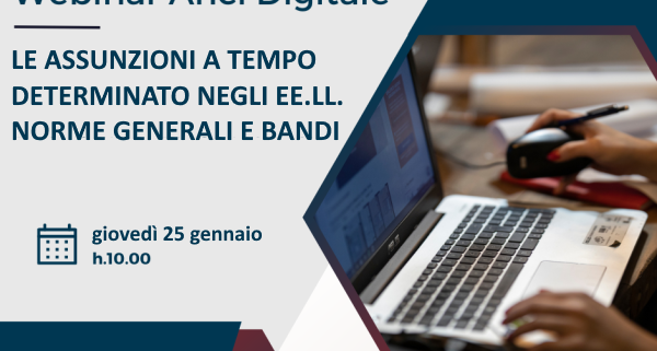 Giovedì 25 gennaio 2024 Anci Digitale propone un webinar gratuito, riservato agli Enti abbonati ai Servizi di Base – Anci Risponde sul tema delle assunzioni a tempo determinato negli enti locali.