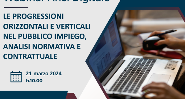 Giovedì 21 marzo 2024 Anci Digitale propone un webinar gratuito, riservato agli Enti abbonati ai Servizi di Base – Anci Risponde sulle più recenti novità introdotte dall’ultimo CCNL e dalla Legge n. 137/2023 in materia di progressioni orizzontali e verticali nel pubblico impiego
